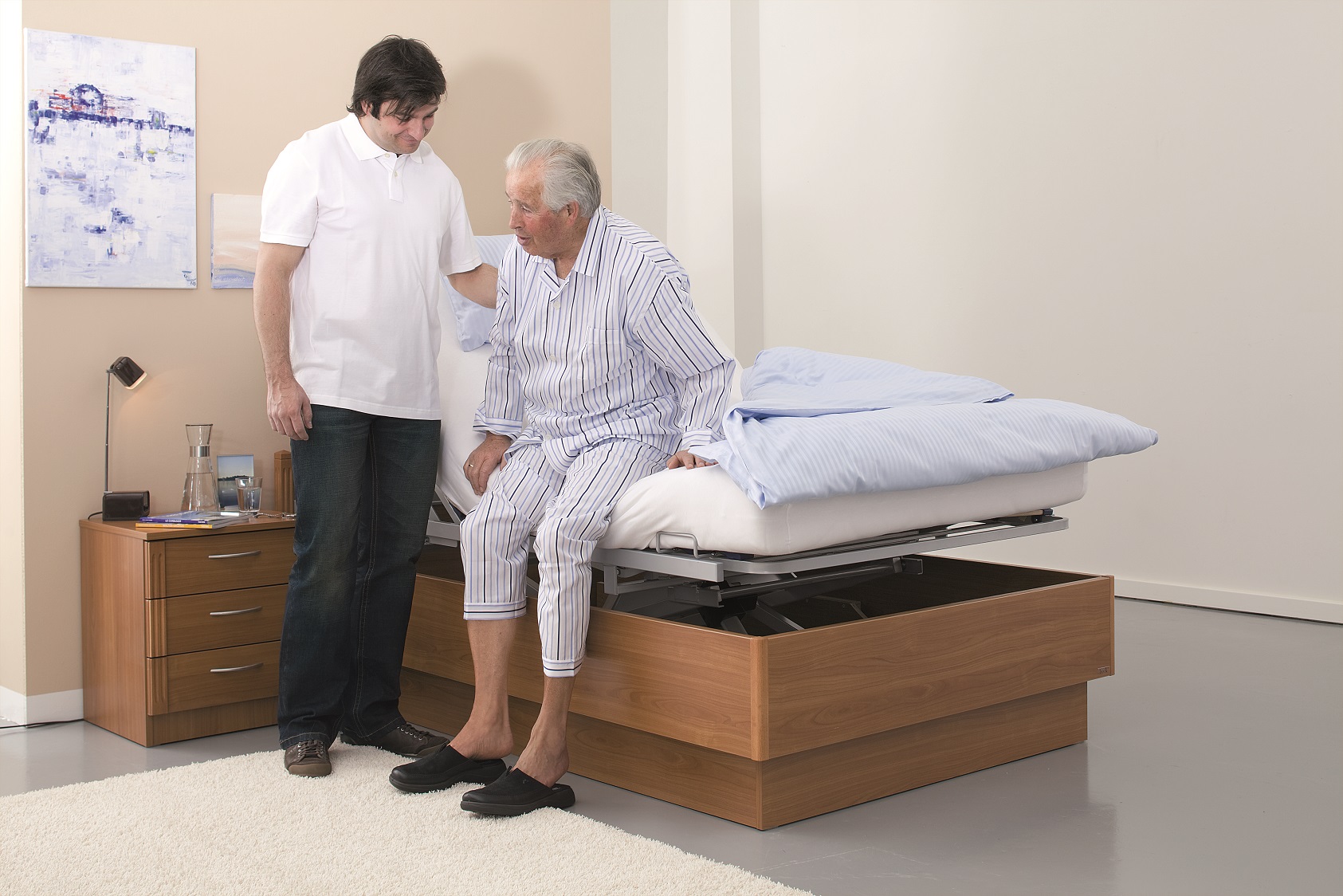 Ein Beistelltisch ist ein praktisches Möbelstück, das neben einem Bett oder einem Sitzplatz platziert wird. In der Pflege wird ein Nachttisch häufig verwendet, um pflegebedürftigen Personen einen bequemen Platz für persönliche Gegenstände, Essen, Getränke oder Medikamente in Reichweite zu bieten ohne das Bett verlassen zu müssen.